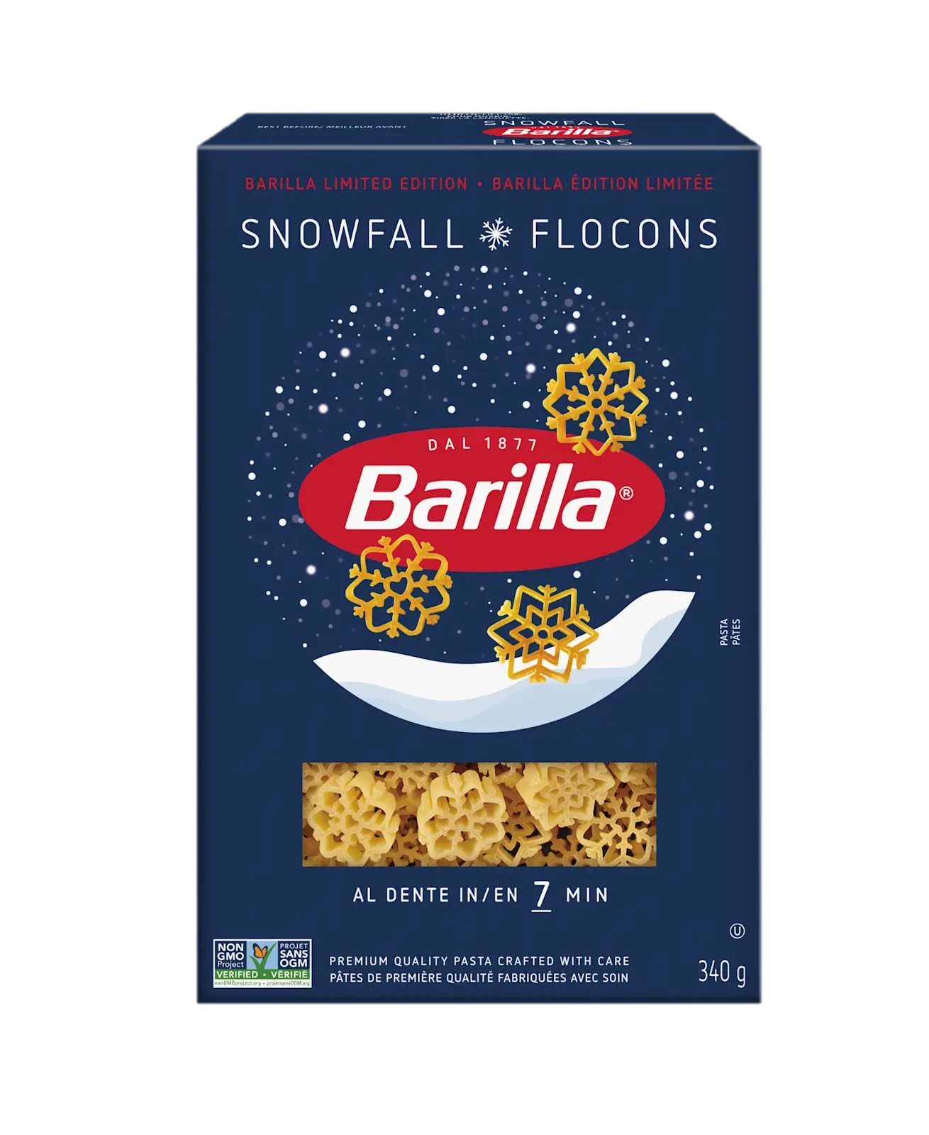 Les pâtes flocons de neige Barilla offrent des pâtes parfaitement al dente en trois formes de flocons de neige uniques. Ces designs saisonniers en édition limitée ajoutent une touche de magie hivernale à vos recettes de pâtes préférées pour les Fêtes ou les recettes de pâtes réconfortantes